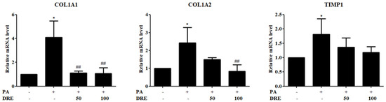 Effects of DRE on fibrosis-related gene expression levels in PA-induced AML12 cells. AML12 hepatocytes were treated with PA (0.5 mM) to induce hepatic fibrosis and co-treated with DRE at 50 and 100 μg/mL. Expression levels of the key fibrotic markers, collagen type I alpha 1 (COL1A1), collagen type I alpha 2 (COL1A2), and tissue inhibitor of metalloproteinases 1 (TIMP1), were assessed via quantitative polymerase chain reaction (qPCR). PA significantly upregulated the COL1A1, COL1A2, and TIMP1 levels compared to those in the control group (* p < 0.05). However, co-treatment with DRE at 50 and 100 μg/mL significantly reduced the COL1A1 and COL1A2 levels in a dose-dependent manner (## p < 0.01 vs. PA-treated group). Although TIMP1 levels were also decreased by DRE, no statistical significance was observed.