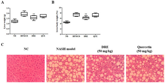Effects of DRE on the liver weight and histological changes in high-fat methionine- and choline-deficient (HFMCD) diet-induced metabolic dysfunction-associated steatohepatitis (MASH) model mice. The mice were fed an HFMCD diet to induce MASH and subsequently treated with DRE or quercetin (QUE, positive control). A normal diet (ND) group was included as a control. (A) Liver weight and (B) the liver-to-body weight ratio (%) were significantly increased in the HFMCD diet-fed group compared to those in the ND-fed group. However, DRE significantly reduced liver weight and the liver-to-body weight ratio (** p < 0.01 vs. HFMCD diet-fed group), thereby providing hepatoprotection. (C) Representative hematoxylin and eosin (H&E)-stained liver sections (original magnification: ×200) showing marked hepatic steatosis and ballooning in the HFMCD diet-fed group. DRE markedly reduced the lipid droplet accumulation, similar to QUE. These results suggest that DRE ameliorates hepatic steatosis and liver hypertrophy in MASH.