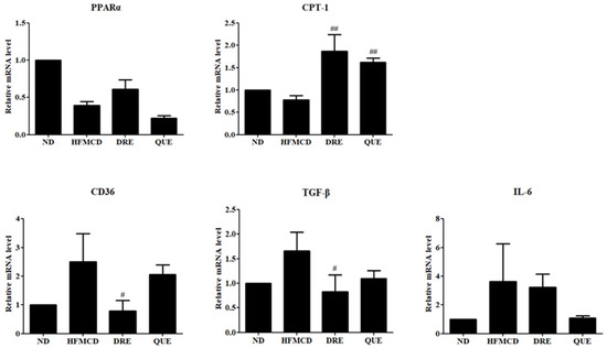 Effects of DRE on lipid metabolism, fibrosis, and inflammatory gene expression levels in HFMCD diet-induced MASH model mice. The mice were fed an HFMCD diet to induce MASH and subsequently treated with DRE or QUE (positive control). An ND group was also included as a control. Expression levels of the peroxisome proliferator-activated receptor alpha (PPARα) were reduced in the HFMCD diet-fed group and not significantly restored by either treatment. Levels of carnitine palmitoyltransferase-1 (CPT-1), a key enzyme in mitochondrial fatty acid β-oxidation, were significantly upregulated by both DRE and QUE compared to those in the HFMCD diet-fed group (## p < 0.01). CD36 and transforming growth factor-beta (TGF-β) expression levels were elevated in the HFMCD diet-fed group but significantly reduced by DRE (# p < 0.05). Moreover, levels of IL-6, an inflammatory cytokine, were elevated in the HFMCD diet-fed group but subsequently decreased by DRE and QUE in a non-significant manner.