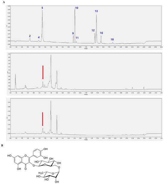Identification of the bioactive compounds in D. racemosum extracts via high-performance liquid chromatography (HPLC) analysis. HPLC was performed to identify the bioactive constituents of the crude extract and DRE using standard compounds. Chromatographic analysis was conducted at 360 nm. (A) HPLC chromatograms of (top) standard mixture, (middle) D. racemosum ethanol extract, and (bottom) ethyl acetate fraction. The x-axis represents the retention time (minutes), and the y-axis indicates absorbance. The following peaks in the standard mixture are labeled in blue and correspond to the numbered standard compounds: 2: Caffeic acid (3.4 min), 4: p-Coumaric acid (4.8 min), 5: Rutin (5.5 min), 9: Apigenin (10.8 min), 10: Kaempferol (11.0 min), 11: Hesperetin (11.3 min), 12: Chrysin (14.6 min), 13: Acacetin (14.8 min), 16: CAPE (15.6 min), and 18: Artepillin C (17.7 min). The retention time of peak 5 matches that of rutin; however, rutin is only a minor component in both the ethanol extract and DRE. This identification is based solely on retention time. The statement that rutin is a major active component has been revised to reflect that rutin is one of the identified compounds. The red arrows indicate that compound 5 has the same retention time. (B) Chemical structure of rutin, a flavonoid compound exhibiting antioxidant, anti-inflammatory, and anti-cancer activities.