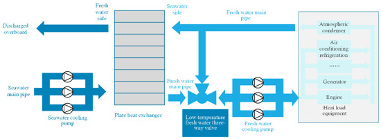 This paper used the central cooling system of a certain type of bulk carrier as the research object. In this system, low-temperature fresh water, cooled by the central cooler, is regulated by the low-temperature fresh water three-way valve (hereinafter referred to as the “three-way valve”) to precisely control its temperature at 36 °C. Subsequently, the low-temperature fresh water is transported by the cooling pump to various heat load equipment for heat exchange and finally returns to the central cooler to complete the cooling cycle (Figure 1).