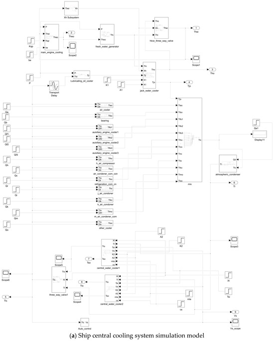 In this paper, the central cooling system of a certain type of ship was taken as the research object, and its dynamic simulation model was established in the Simulink environment using the physical network method. The basic parameters for the model’s design service speed (100% load) operating condition are detailed in Table 1. The simulation system consisted of a mutually coupled high-temperature fresh water loop, low-temperature fresh water loop, and seawater loop. The high-temperature fresh water loop model mainly included the main engine jacket water heat load model, high-temperature fresh water cooler model, fresh water generator model, and dynamic model of the high-temperature fresh water three-way valve (diverting/mixing). The low-temperature fresh water loop model integrated models of key components, such as the central cooler, main engine air cooler, main engine lubricating oil cooler, low-temperature fresh water diverting three-way valve, and other auxiliary cooling equipment. The seawater loop model mainly included the seawater pump model, central cooler (seawater side) model, piping model, etc. The overall structure of the constructed central cooling system Simulink simulation model is shown in Figure 2.
