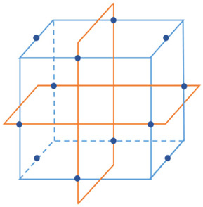 Based on the typical non-linear relationships and potential interactive effects among the parameters of the ship’s central cooling system, the complexity of accurately predicting system energy consumption was significantly increased. To effectively capture these complex second-order effects and parameter interactions, this paper employed the Box–Behnken design (BBD) from response surface methodology (RSM) for experimental design [21] (schematic diagram shown in Figure 3). As an efficient three-level, second-order design method, BBD can construct predictive models containing quadratic and interaction terms with relatively fewer experimental runs. For the five key independent variables (factors) focused on in this study (see Table 3), BBD required only 46 runs to comprehensively analyze the influence of the main effects and interaction effects of each factor on energy consumption, significantly improving the efficiency of experimental design and data analysis and laying the foundation for the refined modeling of system energy consumption.