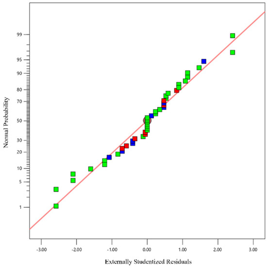 The residual normal probability plot was used to assess the normality of the residuals. As shown in Figure 4, most of the experimental points (blue points) are closely distributed along the regression line, with only a few potential outliers (red points) deviating from it. Overall, this indicates that the model has good accuracy.