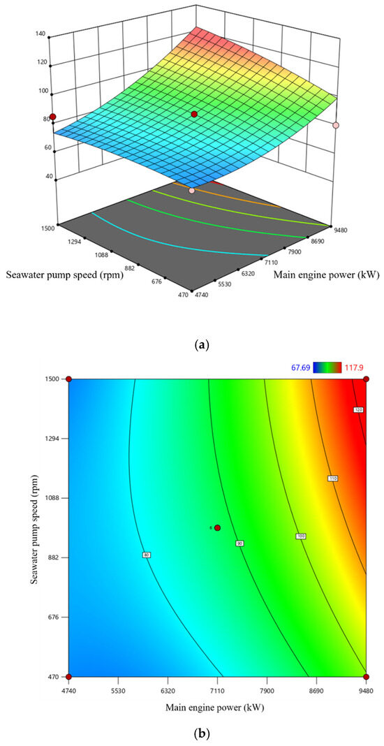 Response surface plot and contour plot of system energy consumption versus main engine power and seawater pump speed. (a) Response surface plot of system energy consumption versus main engine power and seawater pump speed; (b) contour plot of system energy consumption versus main engine power and seawater pump speed.
