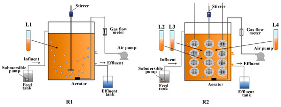 R1 and R2 were started in parallel, and the trends of CODCr, NH4+-N, NO2−-N, NO3−-N, and TN concentrations in the influent and effluent during the operation of the two systems were compared. Each reactor was continuously operated in cycles according to the sequence of influent (15 min), aeration (11 h), sedimentation (30 min), and effluent (15 min), with a water exchange ratio of 1/2 and an accumulated operation of 30 days, for a total of 60 operating cycles. CODCr, NH4+-N, NO3−-N, NO2−-N, TN were measured according to the specific standard methods [27] (Table S2). Data were plotted using Origin 2025. All the experiments were repeated three times, and the data are expressed as the mean ± standard deviation.