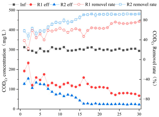 The trends of influent and effluent CODCr concentrations and their removal rates during the operation of R1 and R2 are shown in Figure 2. When comparing the CODCr removal efficiency, it was found that at an average influent CODCr concentration of 301.45 mg/L, the average effluent CODCr concentrations of R1 and R2 were 119.03 ± 3.81 mg/L and 59.93 ± 2.62 mg/L, respectively, with average CODCr removal rates of 60.49 ± 0.23% and 79.94 ± 0.48%, respectively. The average CODCr removal rate of R2 was substantially higher than that of R1, which can be attributed to the addition of SFe that enhanced the catalytic activity of dehydrogenase in the system, thereby accelerating the dehydrogenation reaction of organic matter and promoting the rate of biochemical decomposition of organic matter, resulting in improved CODCr removal efficiency.