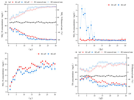 Effects of aerobic starvation on nitrogen removal in each reactor: (a) NH4+-N, (b) NO2−-N, (c) NO3−-N, and (d) TN.