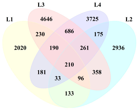 As shown in Figure 4, the microbial diversity analysis of the four mixed-sludge samples identified a total of 13,327 operational taxonomic units (OTUs). Specifically, the number of unique OTUs in the samples from the conventional activated sludge system (L1) and the bio-iron sponge system (BSIS) during the start-up phase (L2), stable-operation phase (L3), and end-of-operation phase (L4) were 2020, 2936, 4646, and 3725, respectively. Notably, the number of OTUs shared among these four systems was only 210. The phenomenon where the number of unique OTUs was significantly higher than that of shared OTUs revealed significant differences in the microbial community structure among the systems. This result clearly indicates that, although there is limited overlap in microbial composition among different samples, the introduction of iron sponge (SFe) significantly promoted the enrichment and succession of new microbial groups, thereby enhancing the diversity level of the entire microbial community at the OTU level.