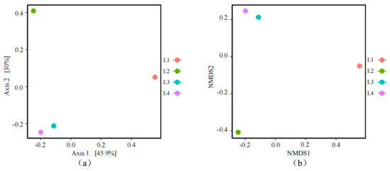 Beta diversity analysis. (a) Principal coordinate analysis (PCoA) and (b) non-metric multidimensional scaling (NMDS) analysis.