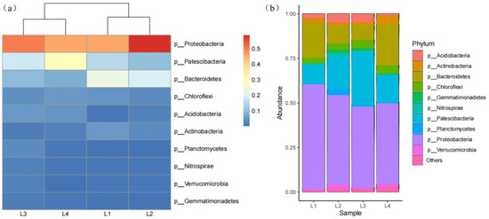 The analysis of the microbial structure and hierarchical clustering of the top 10% relative abundance at the phylum level in the conventional activated sludge system and the BSIS system with an SFe dosage of 90 g/L (initial operation L2, stable operation L3, and final operation L4) is shown in Figure 6. The results indicate that there are differences in the microbial community composition between the conventional activated sludge system and the BSIS system, suggesting that the addition of SFe can alter the microbial community structure at the phylum level. The microbial community composition of the BSIS system during the stable-operation phase (L3) and the final-operation phase (L4) is highly similar, which is consistent with the conclusions of the beta diversity analysis. In L1–L4, the top ten phyla by relative abundance include Proteobacteria, Patescibacteria, Bacteroidetes, Chloroflexi, Acidobacteria, Actinobacteria, Nitrospirae, and some other phyla with relatively low abundance.
