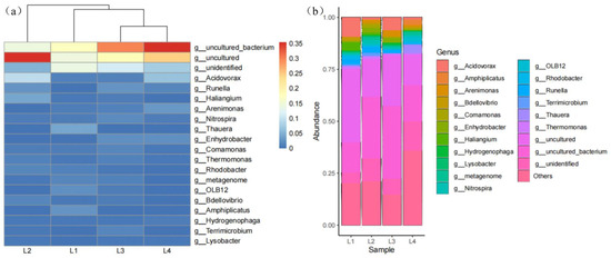 Microbial analysis at the genus level for each sample (top 20%): (a) community structure analysis and (b) hierarchical clustering analysis.