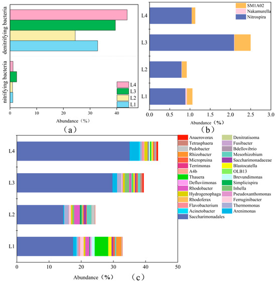 Changes in relative abundance: (a) nitrifying/denitrifying bacteria among samples, (b) nitrifying bacteria, and (c) denitrifying bacteria.
