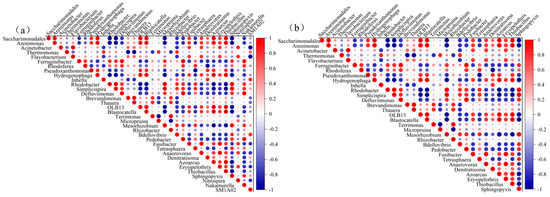 By analyzing Figure 9a,b, complex correlations among different denitrifying bacteria can be observed. For example, there is a strong positive correlation between Saccharimonadales and Acetobacteraceae, indicating that these two genera may be interdependent or co-occur under specific environmental conditions. Similarly, a positive correlation exists between Thermomonas and Flavobacterium, suggesting they may share similar niche strategies or competitive relationships. On the other hand, Rhodothermus and Pseudoxanthomonas show a significant negative correlation, indicating that they may compete for resources in different environments or inhibit each other in the same environment. The negative correlation between Hydrogenophaga and Inhella may reflect their competitive relationship under specific environmental conditions.