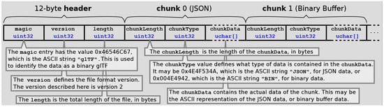 20] and operate on standard formats such as ply, obj or fbx. To date, no publications have addressed the implementation of model watermarking in the glb file, which is a binary version of the graphics library transmission format (glTF). The glTF standard facilitates the storage of sophisticated three-dimensional scenes comprising multiple models and information such as light sources, camera settings, animations, and transformation matrices.