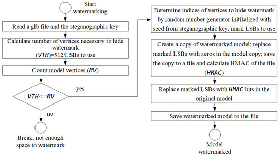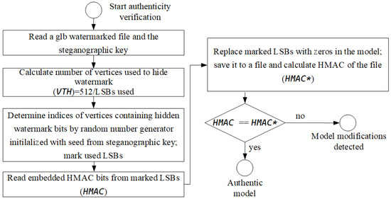 Figure 3. The first step involves determining the vertices where the watermark data will be hidden. The second step involves zeroing, for the appropriate number of vertices in the 3D model, the specified number of bits in the selected vertex attribute, reassembling the modified model and saving it in a new temporary glb file. The next step is calculating the HMAC code based on the entire newly created glb file containing the model after the zeroing bits step. The calculated HMAC is then appended to the model by replacing the previously zeroed bits with the bits of the generated HMAC, then saving the marked model to the glb file. This constitutes the final step in the process. As a result, the model is marked with a fragile, invisible watermark that makes it possible to detect a change of even a single bit in the entire file and thus allows confirmation or denial of the authenticity of the data.
