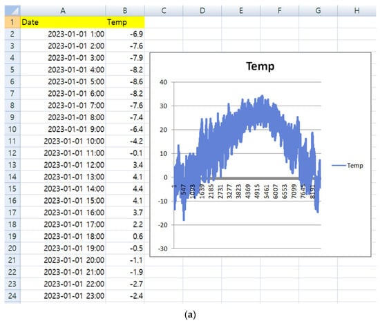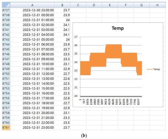 Figure 1a presents the outdoor temperature data sourced from the Korea Meteorological Administration’s open weather data portal for Cheonan, South Korea, whereas