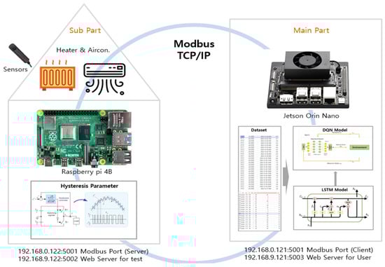 The architecture and configuration of the system consists of the main-part and the sub-part, which are remotely connected using Modbus TCP/IP-based communication protocols. The main-part runs AI algorithms to supervise the overall operation of the system, while the sub-part collects sensor data on temperature and humidity and automatically adjusts room temperature by controlling the heater and air conditioner via a power relay. In addition, the sub-part implements a hysteresis control mechanism to ensure stable operation of the heating and cooling devices. In this experiment, a Raspberry Pi 4B served as the controller of the sub-part and also functioned as a simple experimental server to facilitate comparative experiments, including real-time sensor data monitoring.