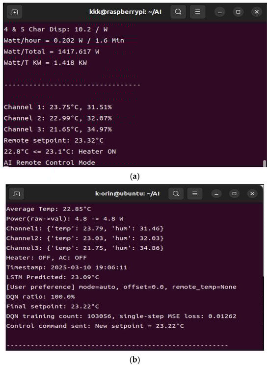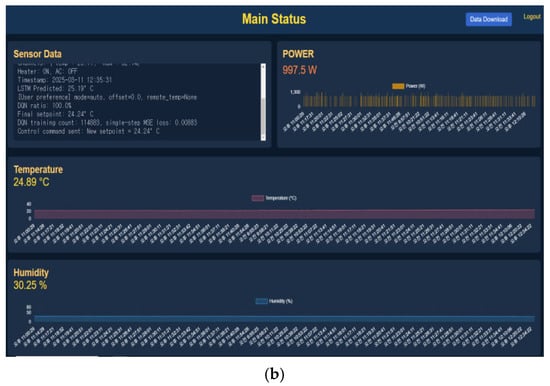 Figure 6b presents the status window reflecting the control actions executed based on the final temperature setpoint generated by the DQN algorithm. This includes temperature and humidity values collected from the experimental warehouse, operational status of the heater and air conditioner, the LSTM model’s predicted temperature output from the AI main controller, the user-defined offset value, the selected control method, and the mean squared error (MSE) value.