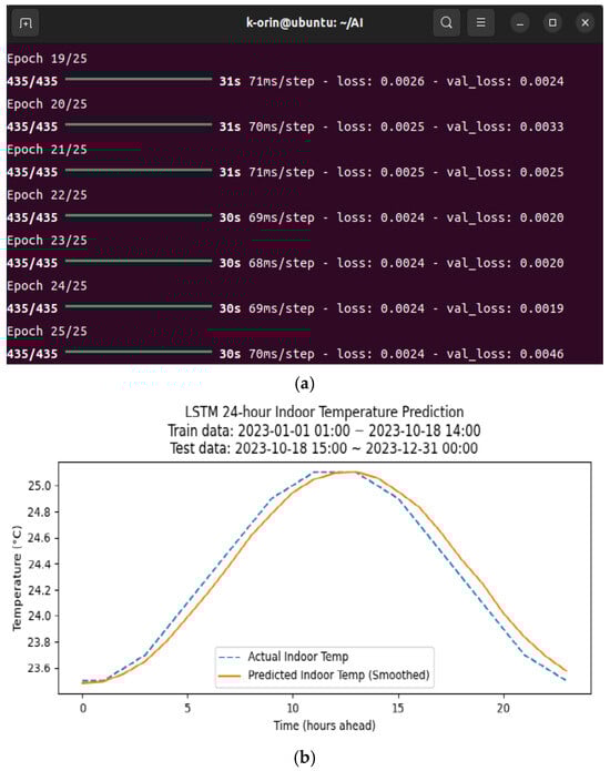 An empirical analysis was conducted in this study to validate the temperature control algorithm, beginning with the dataset preprocessing required for constructing the LSTM model. The outdoor and indoor temperature datasets were imported and sorted chronologically by timestamp. Subsequently, hour and month information were extracted from each timestamp, and sine and cosine transformations were applied to create features capturing periodicity. All features—including indoor and outdoor temperatures, along with the sine and cosine values corresponding to hour and month—were normalized to a range between 0 and 1 using the MinMaxScaler (version 1.7.0). Next, input sequences were constructed using temperature data from the preceding 24 h (seq_length = 24) to predict the temperature for the following 24 h (forecast_horizon = 24). The entire dataset was then partitioned into training and testing sets in 80–20% ratio. The LSTM model, composed of two LSTM layers followed by a dense layer, was trained on the training set. The predicted temperatures generated from the test dataset were inverse-transformed, constrained to an upper temperature limit, and smoothed using exponential smoothing. Finally, the smoothed predictions were plotted against the actual temperatures on a 24 h prediction time axis to evaluate the performance of the LSTM model.