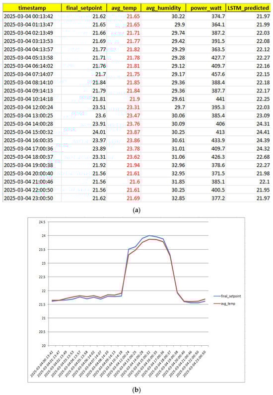 Figure 7a presents the Excel dataset, including hourly measurements of indoor average temperature (avg_temp), control target temperature (final_setpoint), humidity (avg_humidity), power consumption (power_watt), and the predicted temperature from the LSTM model (LSTM_predicted), recorded on 4 March 2025.