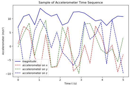 Accelerometer time sequence: accelerations (dashed red, green, blue), with magnitude (solid).