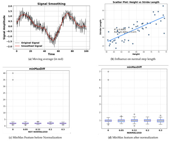 (a) Moving average smoothing effect. (b) Step length influence on normal step length. (c) MinMax feature scaling before normalization. (d) MinMax feature scaling after normalization.
