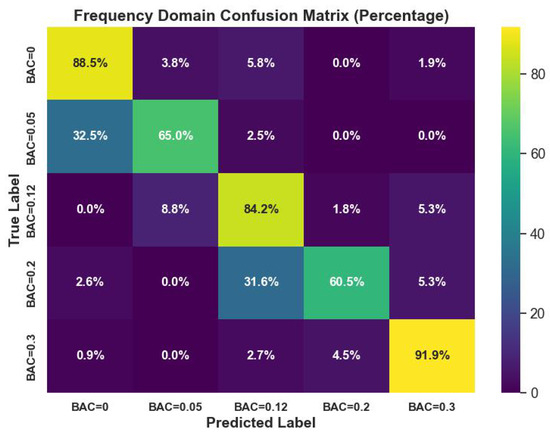 J48 classifier confusion matrix performance on frequency-domain features with p-values < 0.05.