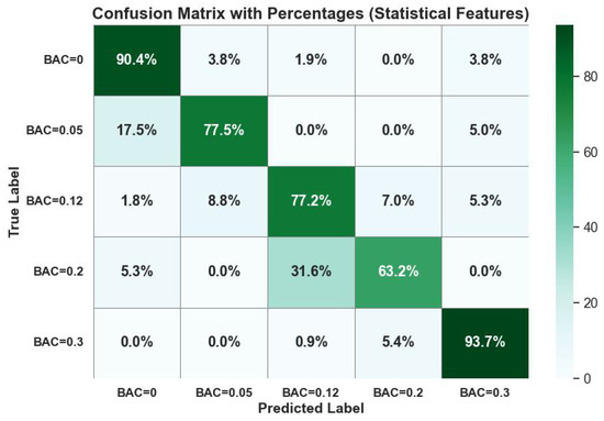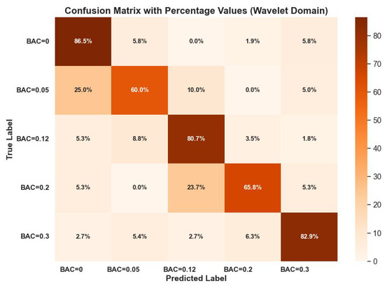 Random forest classifier confusion matrix performance on wavelet-domain features with p-values < 0.05.