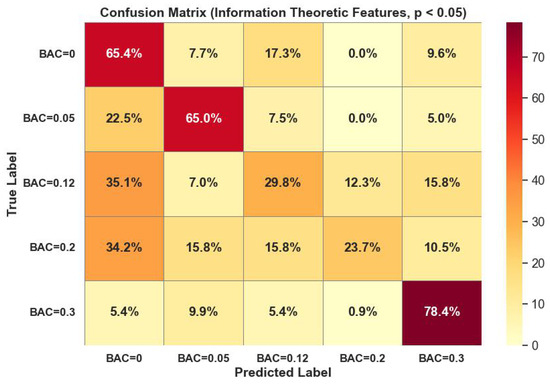 Random forest classifier confusion matrix performance on information-theoretic domain features with p-values < 0.05.