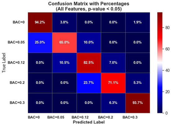 Random forest classifier confusion matrix performance on time-domain features with p-values < 0.05.