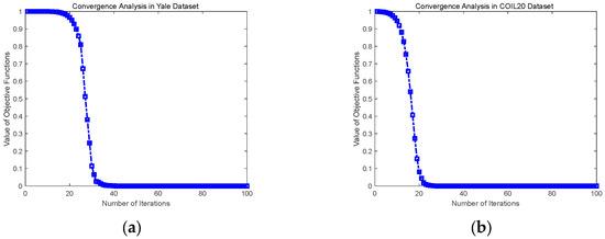 Convergence Curves (a) Convergence Curve in Yale data set; (b) Convergence Curve in COIL 20 data set; (c) Convergence Curve in ORL data set; (d) Convergence Curve in Reuters data set.