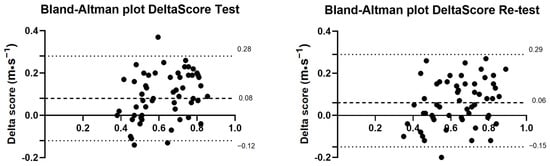DeltaScore: Differences between perceived velocity and real velocity (Vp − Vr); Vr: real velocity; Vp: perceived velocity. Test: Test session 48–72 h after the familiarization protocol; Re-Test: Test session 4 weeks after the test session.