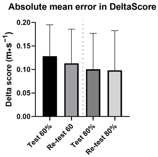 Absolute DeltaScore: Absolute differences between perceived velocity and real velocity (|Vp − Vr|); Vr: real velocity; Vp: perceived velocity; Test 60%: Error in |Ds| with 60%1RM during the test session; Test 80%: Error in |Ds| with 80%1RM during the test session; Re-test 60%: Error in |Ds| with 60%1RM during the re-test session; Re-test 80%: Error in |Ds| with 80%1RM during the re-test session; Test session 48–72 h after the familiarization protocol; Re-Test: Test session 4 weeks after the test session.