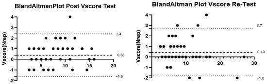 The three-way repeated-measure ANOVA revealed significant effects only for velocity loss (F(1) = 33.54, p < 0.001, η2 = 0.72), meanwhile a trend for load (p = 0.06, η2 = 0.25), and load*velocity loss interaction (p = 0.08, η2 = 0.06) was found, indicating that Vscore is influenced mainly by velocity loss. Conversely, time, load*time, velocity loss*time, and load*velocity loss*time interactions were not significant (p > 0.05). The results of the Bland–Altman plot for Np and Nr are presented in Figure 4. ICC showed an excellent correlation between Nr and Np in both the test and re-test sessions (Table 1). Linear regressions revealed similar R2 values between the pre- and post-test conditions (Table 1). Lastly, the |Vscore|, categorized by load and velocity loss, are reported in Figure 5. A posteriori power analysis to assess the statistical power of significant results for %VL in PVL was performed. Based on our dataset, we set the test family to F-test and used a repeated-measure ANOVA (within factors) with an alpha level of 0.05. In the three-way ANOVA for %VL, we observed an effect size of η2 = 0.72, which corresponded to a statistical power of 0.99. These findings indicate that, despite a small sample size, the statistical power for %VL in PVL was extremely high, suggesting that the limited sample size was not a constraint.