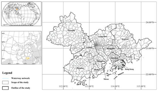 Geographic extent of the study area and the distribution of primary waterway networks across the Guangdong–Hong Kong–Macao Greater Bay Area.