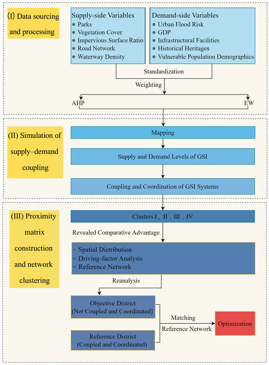 Framework for optimizing the spatial balance of Green Stormwater Infrastructure (GSI) in the Greater Bay Area (GBA), comprising three components: (I) data sourcing and processing; (II) simulation of supply–demand coupling; and (III) proximity matrix construction and network clustering.