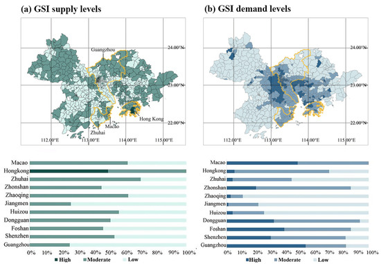 Classified spatial distribution of GSI supply and demand across the GBA. (a) GSI supply levels. (b) GSI demand levels.