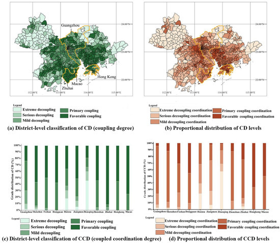 Spatial patterns of GSI coupling and coordination in the GBA. (a) District-level classification of CD (Coupling Degree); (b) proportional distribution of CD levels; (c) district-level classification of CCD (Coupled Coordination Degree); and (d) proportional distribution of CCD levels.