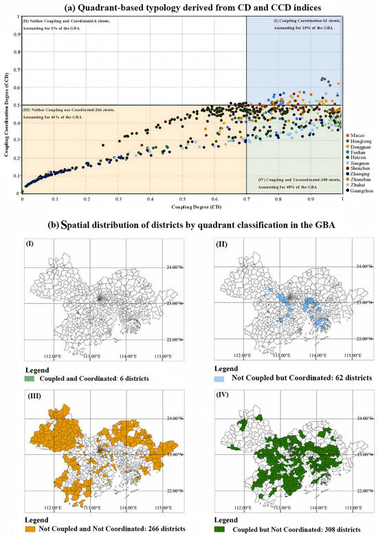 To further delineate spatial mismatches, a quadrant analysis was conducted by combining CD and CCD classifications. This approach categorizes districts into four types based on their coordination profiles: (I) Coupled and Coordinated, (II) Not Coupled but Coordinated, (III) Not Coupled and Not Coordinated, and (IV) Coupled but Not Coordinated (see Figure 5).