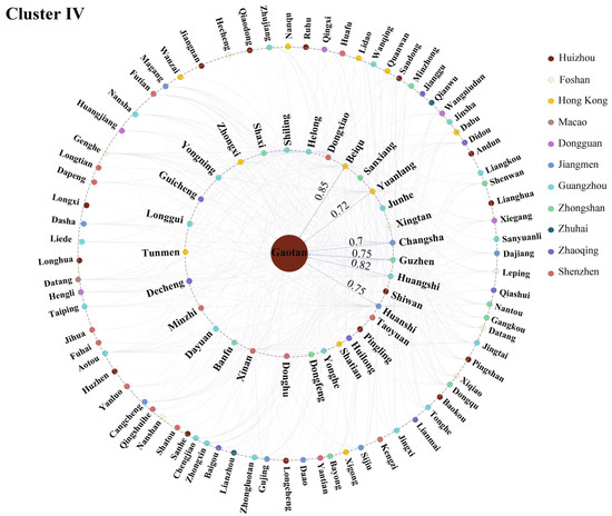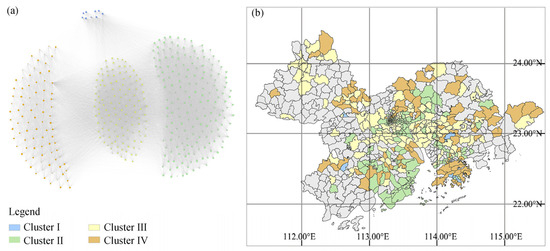 Figure 6a illustrates the spatial clustering of districts within the GBA that exhibit high GSI demand based on proximity network analysis. Districts with marginal supply and demand characteristics were excluded from this analysis to ensure the clarity and relevance of clustering outcomes. A total of 399 districts were grouped into four clusters, defined by the relative prominence of specific demand indicators as determined through the RCA metric.