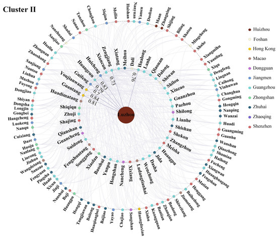 Figure 7, Figure 8, Figure 9 and Figure 10 display the proximity-based reference network maps for each cluster. In these diagrams, districts within the inner circle are strongly associated with the reference district based on high proximity scores, indicating similar vulnerability patterns and planning contexts. For instance, in Wuhe Township (Figure 7), high-probability reference relationships are established with Dong District (0.75), Shenshuipo District (0.80), and Huawangtong District (0.75). In Luzhou Town (Figure 8), similar patterns are observed with Hualong Town (0.70), Huicheng Street (0.83), and Zengjiang Street (0.70). In contrast, districts located in the outer circle of the reference network maps indicate weaker coordination between GSI supply and demand. These areas could benefit from adaptive strategies drawn from their inner circle counterparts or from potential cross-district collaborations to improve collective resilience. In some cases, districts with limited resources or fragmented infrastructure may be considered for integration or cooperative planning with neighboring municipalities.
