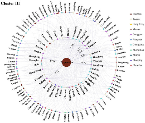 Cluster I includes nine districts, primarily located in Hong Kong and Macao (Figure 7). The defining features of this cluster include a high concentration of traffic facilities (90%), medical institutions (80%), and educational institutions (90%). These indicators reflect the vulnerability of compact, high-density built environments, where the disruption of essential services during urban flooding poses significant risks. Cluster II comprises 179 districts, distributed mainly across Guangzhou, Shenzhen, Zhuhai, and Zhongshan. This cluster is strongly associated with population structure indicators, including a high proportion of female residents (70.4%), children under the age of 14 (93.6%), elderly individuals over 60 (79.1%), and residents with less than a high school education (83.6%). These demographic characteristics point to heightened social vulnerability, suggesting that dense populations with limited adaptive capacity are at increased risk from urban flooding.