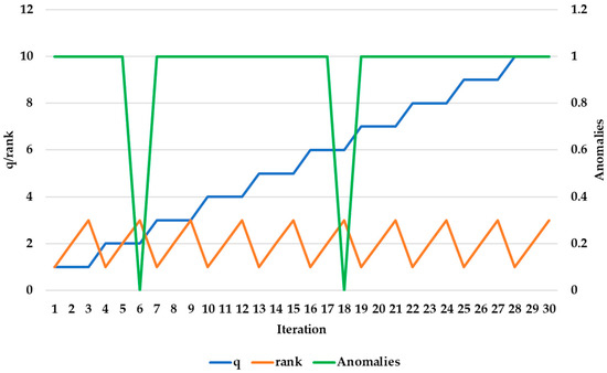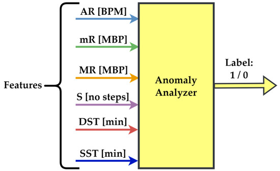 The first three parameters are quantified in BPM, S is measured in the number of steps, and the last two in minutes, as shown in Figure 1, which presents the feature diagram for the dataset built for a single patient. If an anomaly is identified, the output of the employee’s anomaly analyzer algorithm is 1. In this case, an alert is released. Otherwise, the output is 0.