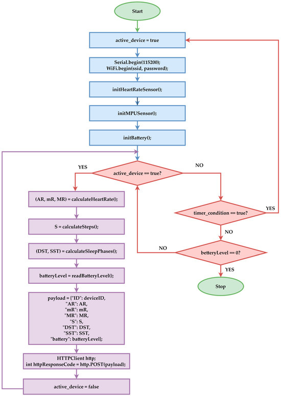 Figure 2 presents the simplified logical schema of the embedded device. Each device has a unique identification code (ID). This code establishes the correlation between the monitored patient, the device, and the evolution of the six monitored parameters over time for that specific patient. The embedded device’s algorithm initializes serial communication and Wi-Fi connection to transmit data to the central server. Subsequently, the two sensors are initialized and read the battery level. Heart rate measurements are collected over a defined interval in a continuous loop to determine the maximum, minimum, and average values. Afterward, the six monitored parameters are calculated. The M5Stack receives and preprocesses data from all sensors. It forms a JSON payload with all necessary values, including the battery level information. Using the integrated Wi-Fi module, the M5Stack sends the data via an HTTP POST to the ASP.NET API server, which collects the information for anomaly analysis. The system disables data reading until the condition is met again. During the entire period of system deactivation, it remains in power-saving mode. Exiting this mode occurs when a new reading is required or the battery is fully depleted. Figure 2 presents a simplified schema, as each parameter has different time conditions in reality. For example, heart rate monitoring is performed more frequently than sleep monitoring.