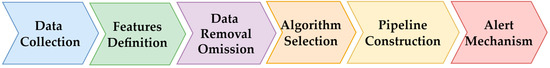 These conceptual steps are schematically presented in Figure 5. For building the software pipeline, the Azure platform was chosen due to its multitude of features, which are necessary for managing a distributed monitoring system. Azure allows everything from data storage and processing to the automatic generation of alerts and workflow management. To achieve HADA integration, the following components were used: