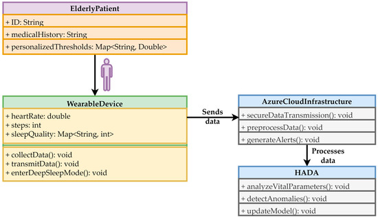 The UML diagram presented in Figure 4 includes the patient level, corresponding to the system’s end user. He receives medical help in the event of anomalies and is subject to medical interventions when necessary. The wearable device collects vital data and transmits this data to the cloud infrastructure in real-time. As mentioned, this device features energy-saving capabilities, including a deep sleep mode. The cloud infrastructure ensures data transmission security through its mechanisms, preprocesses the data, transfers it to HADA, and generates alerts for patients or caregivers. HADA analyzes vital parameters using PCA, detects anomalies, and periodically updates the model to adapt to changes in patient conditions.