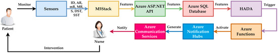 The data flow is designed such that, as soon as the M5Stack collects and preprocesses the data, it is transmitted via a secure Wi-Fi connection to Azure SQL Database through an ASP.NET API, as depicted in Figure 4. Once received, the data is routed to a dedicated Azure Function, which retrieves the values, further preprocesses them, and passes them to the HADA model for evaluation. If the model identifies an anomaly, Azure Functions immediately triggers a set of automated actions: