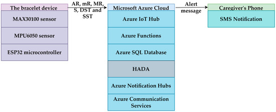 The proposed system comprises a wearable bracelet equipped with a MAX30100 heart rate sensor (manufactured by Analog Devices Holdings Co., Ltd., Shanghai, China) and an MPU-6050 accelerometer (produced by TDK InvenSense, Shenzhen, China) for tracking steps and sleep. Data is continuously transmitted to an Azure-based cloud platform via secure Wi-Fi communication. The cloud infrastructure preprocesses the data, applies anomaly detection algorithms, and triggers alerts when necessary.