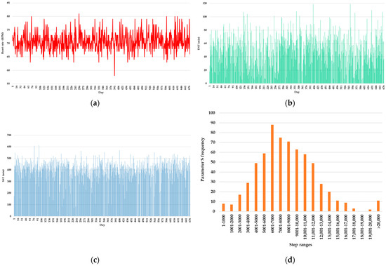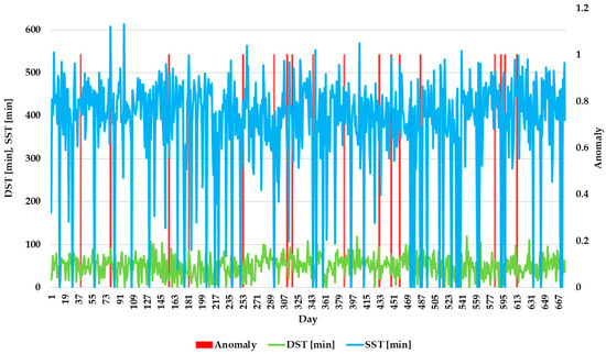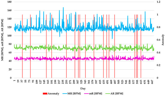 Based on these considerations, a unique analysis is required for each monitored person. This unique model enables precise alerts tailored to personalized statistics for each individual. Therefore, the dataset is built for a single patient because individualized monitoring enables obtaining a detailed and accurate profile of vital parameters without the interference caused by inter-individual variability. The analyzed dataset spans a two-year period, from 1 January 2023 to 31 December 2024. The frequency of activity data for life-threatening parameters (AR, mR, and MR) is 725,338 records, while the general state parameter S contains 9455 records, and the rest (DST and SST) contain 680. The output of the anomaly analyzer is referred to as a label.